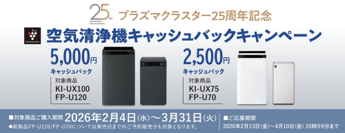 シャープ 空気清浄機キャッシュバックキャンペーン開催(2月)